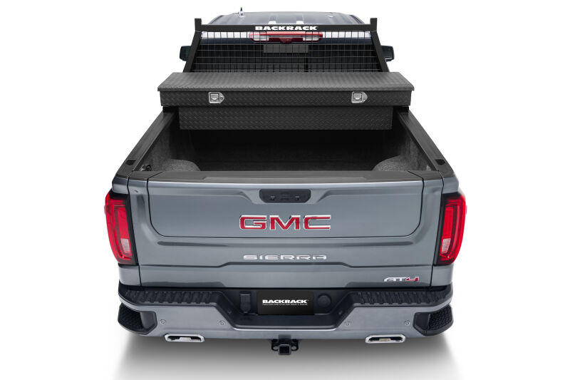 Has welded wire mesh to provide full window protection. Has wider carrying capacity above cab. Each intersection of wire is welded to avoid rattling and provide strength. Less flexibility to mount accessory light brackets than the BACKRACK(TM). Is more expensive than the BACKRACK(TM). Sits higher above the cab than the BACKRACK(TM).