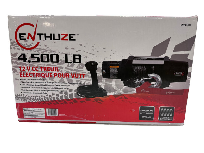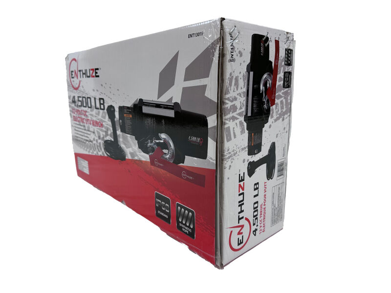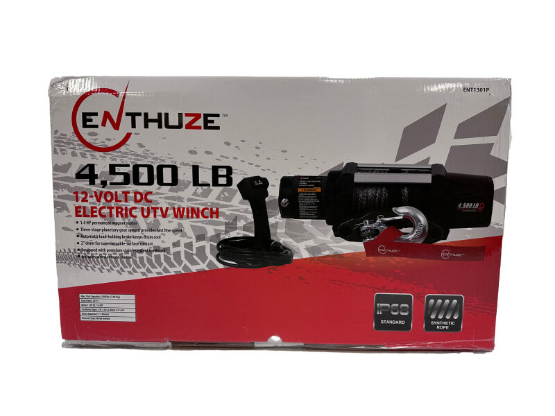 The Enthuze 4,500lb 12V DC Electric ATV/UTV Winch features a 1.4 HP permanent magnet motor that stays cooler during long pulls. The three-stage planetary gear system provides fast line speed. The automatic load-holding brake ensures maximum safety. The free spooling provides a fast line-out, while the 12’ ergonomic handheld remote control allows for safe operation at a distance. The winch contains an Aluminum Hawse Fairlead and an aircraft-grade Synthetic rope.