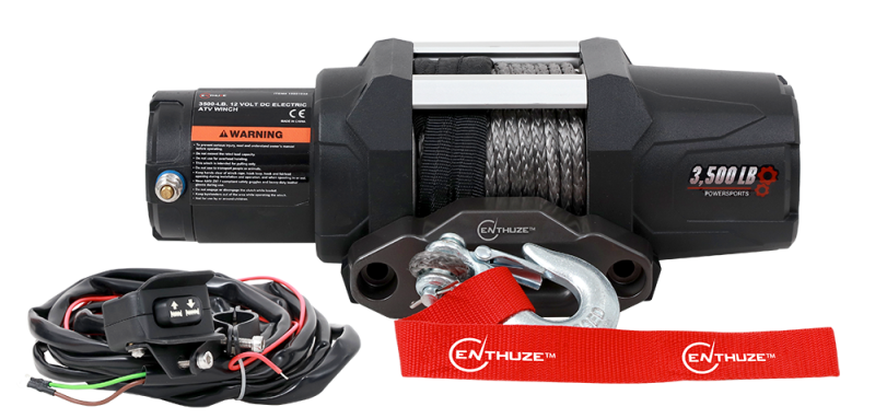 The Enthuze 3,500lb 12V DC Electric ATV/UTV Winch features a 1.3 HP permanent magnet motor that stays cooler during long pulls. The three-stage planetary gear system provides fast line speed. The automatic load-holding brake ensures maximum safety. The free spooling provides a fast line-out, while the 10’ ergonomic handheld remote control allows for safe operation at a distance. The winch contains an Aluminum Hawse Fairlead and an aircraft-grade Synthetic rope.