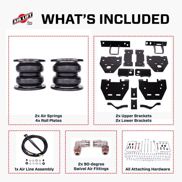 Offering up to 7,500 pounds of load-leveling capacity, the LoadLifter 7500 XL Ultimate kit for the 2023-2025 Ford F-450 4WD from Air Lift will make towing and hauling a comfortable and stress-free experience. Our fully adjustable, industry-leading air springs are the perfect upgrade for your vehicle and work to eliminate any issues you might face when towing and hauling, such as vehicle squat, poor headlight aim, trailer sway, body roll, and bottoming out. While maintaining exclusive features from our other systems, including roll plates for added protection and ultra-high-strength composite formula end caps, what sets the LoadLifter 7500 XL kit apart is a pair of massive 7-inch, double-convoluted bellows air springs. The larger air springs allow for greater leveling abilities at lower air pressures compared to similar systems, keeping your cargo safe and secure while ensuring a more comfortable ride. Installing the kit is simple, requiring only common hand tools and no frame drilling. The LoadLifter 7500 XL Ultimate kit has clear, easy-to-follow instructions and an underframe design that works with most in-bed hitches. As the leader in air suspension products for over 75 years, Air Lift is committed to delivering quality load support products that fit, work, and last. To ensure the highest quality, longevity, and customer satisfaction, the key suspension components, including the air springs and all hardware, have all been torture-tested to 1 million cycles on our hydraulic test rig. With a limited lifetime warranty, a 60-day ride satisfaction guarantee, and a dedicated in-house customer service team, you can purchase this kit with peace of mind. Do not exceed the vehicle’s gross vehicle weight rating (GVWR). Internal jounce bumper absorbs shock and can be safely run with zero PSI.