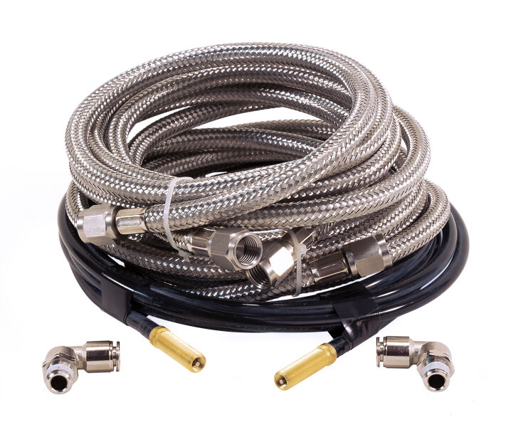 Upgraded components, including 10 feet of flexible, stainless-steel braided air lines, military-grade AN fittings, and stainless steel roll plates which protect the air springs and help increase load capacity of the springs by up to 10%