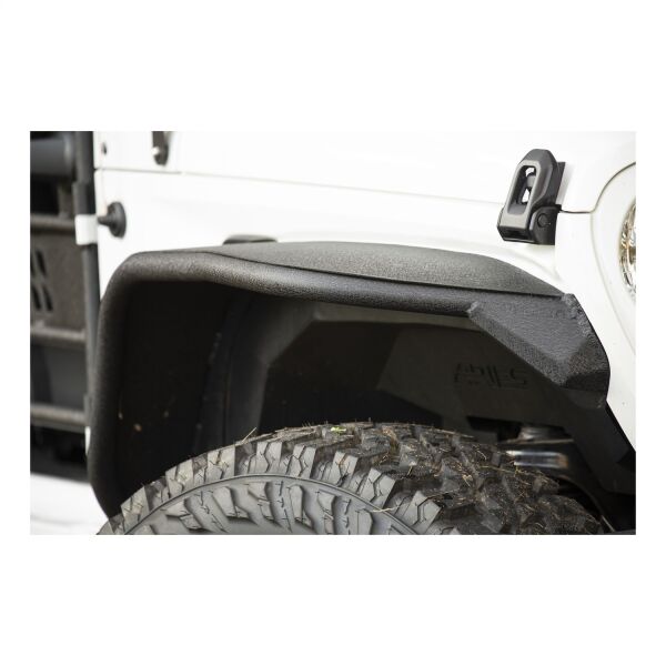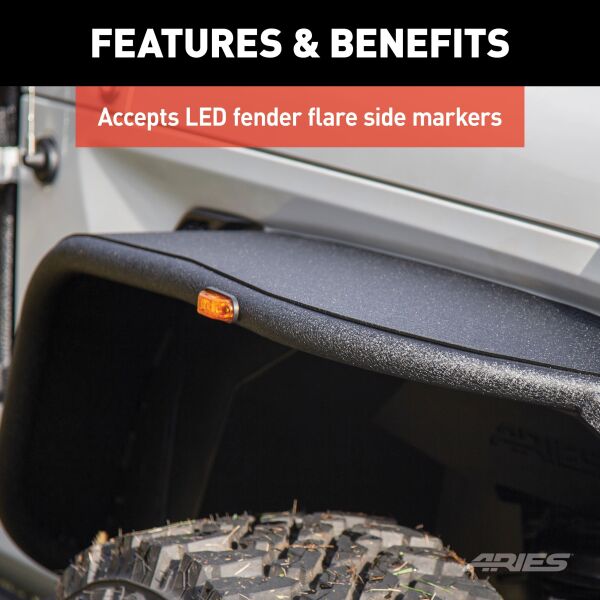 ARIES Jeep fender flares add style and offroad readiness to your Jeep Wrangler JL, featuring rust-free aluminum construction, custom-fit contours and a narrower width to show off larger, offroad tires. Hardened, T6 aluminum alloy construction allows these fender flares to be strong, lightweight and rust-free. To maximum corrosion resistance, they are also covered in a unique textured black powder coat finish that helps hide minor scratches and grime accumulated on the trail. They are also available in paintable, raw aluminum for added customization. ARIES Jeep fender flares are designed to replace the Jeep factory fender flares to better accent larger tires on offroad-style Wranglers. The narrowed width gives them a sleek, trail-ready look, while still maintaining excellent functionality. ARIES Jeep fender flares also feature a vehicle-specific contour to offer a precise fit and added style. ARIES fender flares can also accept ARIES fender flare side markers #1500240 to maintain safety and help keep the vehicle street-legal. ARIES fender flares come with all necessary mounting hardware for a complete installation and are sold in pairs for the front or rear (some drilling may be required).