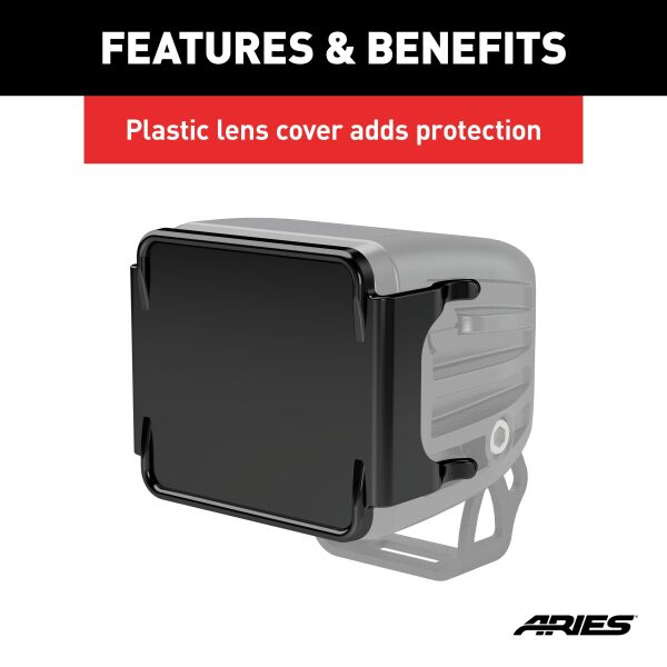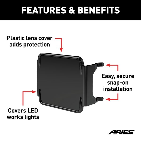 ARIES LED light bars and work lights help turn any truck, Jeep or SUV into the ultimate off-road ride. They are built with grade-A LED chips, an IP68-standard breather, waterproof aluminum construction and a 50K-hour lifespan. For all ARIES LED light bars or work lights, we offer LED light covers. These covers help make the vehicle street-legal in states where covers are required on the road (not all states require LED light covers). The lenses are made with a durable black plastic and provide a protective shield against scratches and road grime. This particular package includes two LED covers to protect ARIES 2" square LED work lights #1501252. All ARIES LED covers feature a simple, secure snap-on mounting system to install in seconds without any hardware or tools required.