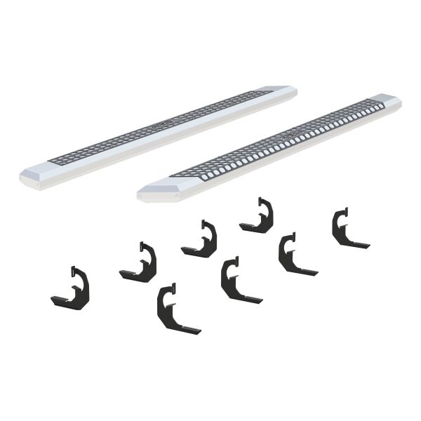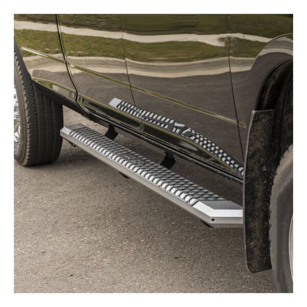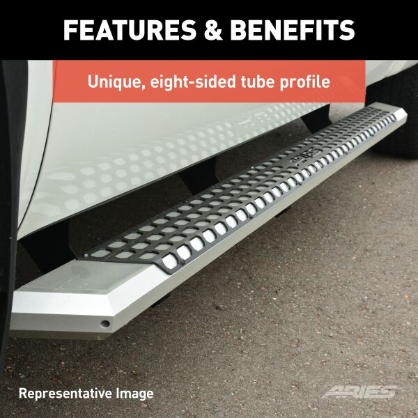 ARIES AdvantEDGE side bars do away with the common, rounded look of other side bars, nerf bars and running boards, featuring an angular, eight-sided tube profile and powder-coated all-aluminum construction. The angular edges provide a clear-cut, uncompromising accent for the look of today's trucks. Made from 5-1/2" wide, eight-sided, extruded aluminum tubing, AdvantEDGE running boards are strong, lightweight and impervious to rust, offering a solid step that is built to face the elements and outlast them. They also come with die-cast aluminum end caps and a stamped aluminum tread. The aluminum treads provide a long-lasting, non-skid stepping surface that will not crack or fade in the sun. ARIES AdvantEDGE side bars are also marked for their easy, custom-fit installation. They feature the ARIES VersaTrac mounting system with brackets that are made from powder-coated steel and built for specific vehicles. This particular set of custom running boards fits specific years of the Chevy Silverado, Avalanche, Tahoe or Suburban and GMC Sierra or Yukon (see application info to verify compatibility). The high-strength steel brackets mount using pre-existing holes, and the aluminum running boards attach to the brackets with heavy-duty hardware. The VersaTrac mounting system makes installation simple and customizable, allowing the side bars to be swapped out at any time with other side steps or running boards that use the VersaTrac system. Setting yourself apart is simple with the ARIES AdvantEDGE series. In addition to these truck side steps, we also offer the AdvantEDGE bull bar and AdvantEDGE headache rack, featuring the same all-aluminum construction and eight-sided tube profile. For a fully customized look to match your pickup, AdvantEDGE side bars are available in two finish options, including carbide black powder coat and chrome powder coat.