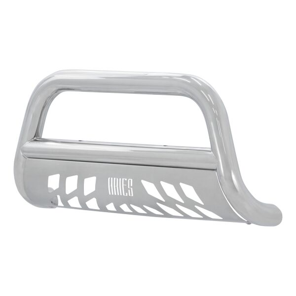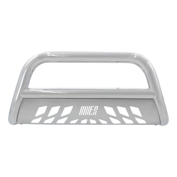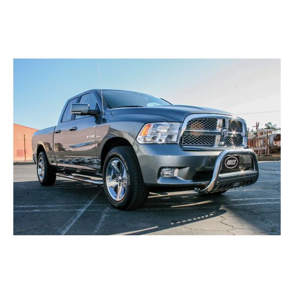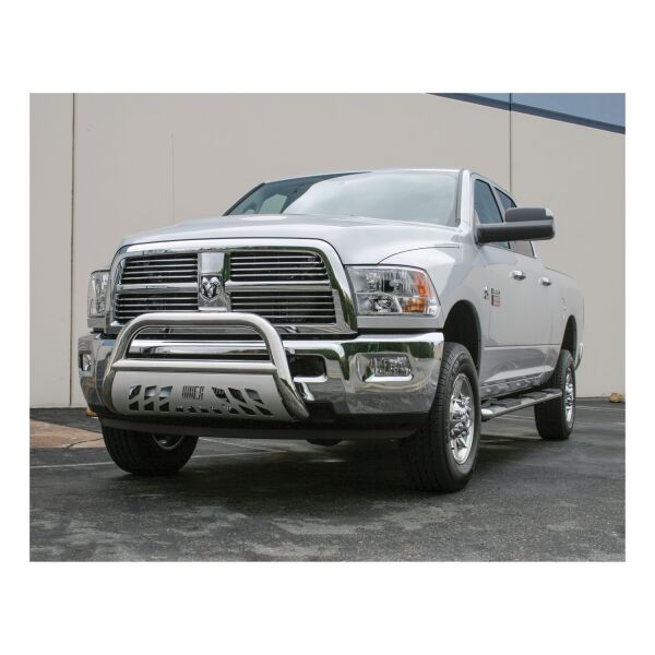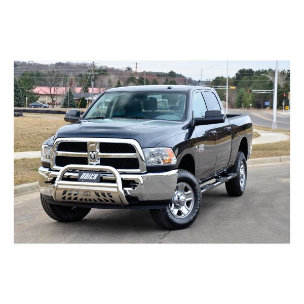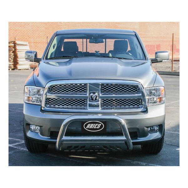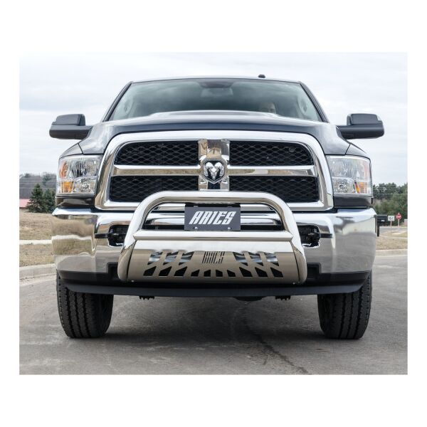 The ARIES 3" bull bar is made for those who face the uncertain road without fear. This particular model is constructed from 304 stainless steel. 304 stainless is high in nickel content, allowing the bull bar to easily resist water, road salt and rust and maintain its mirror-like polished finish in spite of the elements. Other available finishes include high-gloss black stainless steel, textured black steel and semi-gloss black steel. Customizing the look of your vehicle is simple with the ARIES 3" bull bar. It is equipped with pre-drilled light mounting holes and a removable skid plate. The center crossbar features two pre-drilled holes that readily accept an LED light bar or two LED work lights. The skid plate is made from 304 stainless steel and has a brushed finish to stop rust and hide scratches and scuffs. It also features an aggressive, ARIES-exclusive cutout pattern and can be removed for a customized look. Each ARIES 3" bull bar is made a vehicle-specific design, meaning that for each make and model, the bull bar has a custom bend and unique mounting brackets. This allows for the best possible fit on your vehicle and ensures solid attachment. The brackets also use pre-existing factory holes in the vehicle's frame to eliminate drilling, speed up installation and increase rigidity. This bull bar fits select model years of the Ram 2500 or 3500 and Dodge Ram 1500, Ram 2500 or Ram 3500 (see application info to verify fitment).