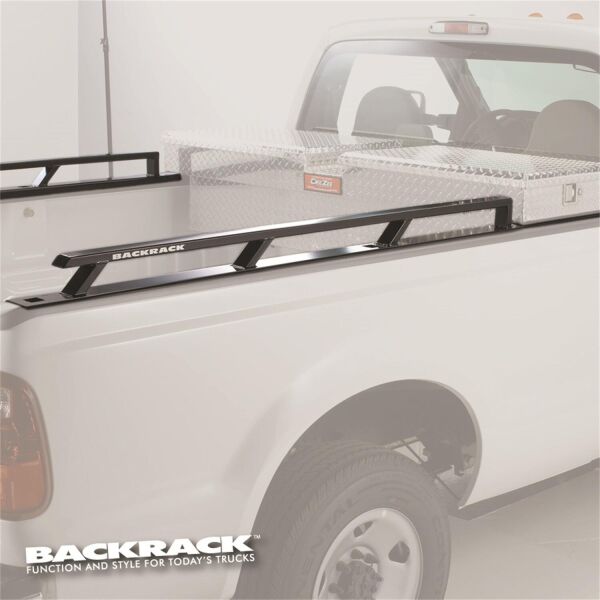 SERIOUS STRENGTH: We get it. You do not want Siderails that try to look tough but have no purpose. BACKRACK(TM) Siderails are industrial grade and designed for trucks that push the envelope of on-the-job abuse. Heavy gauge HRPO tube is fully welded to an angular base that runs the full length of your truck bed. We expect you to overload your truck. BACKRACK(TM) Siderails are ready to handle whatever you bring to the job site. RUGGED GOOD LOOKS: If it wears the BACKRACK(TM) brand name it has to be work ready, but it can still look good while getting the job done. BACKRACK(TM) Siderails are designed to compliment the angles of our Cab Guards. Siderails install with or without our Cab Guards and are fully compatible with Crossbed Toolboxes. SIMPLE NO DRILL INSTALLATION: Drop them on and bolt them in. It is almost that simple. Once you secure the custom Stake Pocket Bolts into the stake holes, the Siderails drop into the pockets over the bolts. Turn down the nuts with a ratchet, and finish the installation by inserting the plastic caps inside the stake holes to hide all the fasteners. Very slick. TOOLBOX FRIENDLY: BACKRACK(TM) Siderails are available for both 6.5 ft and 8 ft bed lengths. The Tube Rail is available in two configurations: the FULL RAIL, which extends the full length of the truck bed and the TOOLBOX RAIL, where the Tube Rail stops short to accommodate the insertion of a cross bed Toolbox.