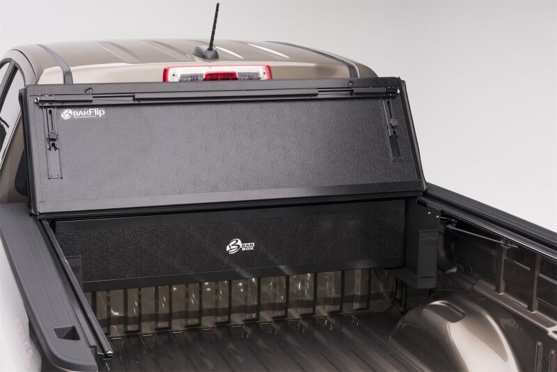 The BAKBox2 is a toolbox for the back of your truck that is designed to integrate with a BAK truck bed cover. Unlike a regular toolbox, the BAKBox2 has a wealth of design innovation built into it that sets it apart from any other toolbox The BAKBox2 can conveniently fold away when not in use, giving you full bed access when need to haul large loads. It's made from solid FRP composite panels, making more impact resistant than an aluminum toolbox. Like all BAKFlip truck bed covers, the BAKBox2 lays completely flush, and doesn't stick out above the rails of your truck, providing a clean, stylish look. BAKBox2 is made in the USA. installs quickly, and is guaranteed to last as long as your truck does.
