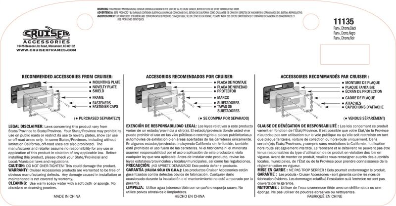 Cruiser Accessories is a family owned business that has been manufacturing and selling license plate frames for over 30 years. Through innovation, attention to detail and many patented designs, Cruiser has evolved into the largest supplier of license plate frames, novelty plate shields and mounting hardware in the automotive aftermarket. Cruiser's product line also includes both standard and exclusive Star Pin locking hardware, designer fastener caps, mounting accessories, motorcycle frames and 3d-Cals decals. Let Cruiser Accessories complete your ride's look today!