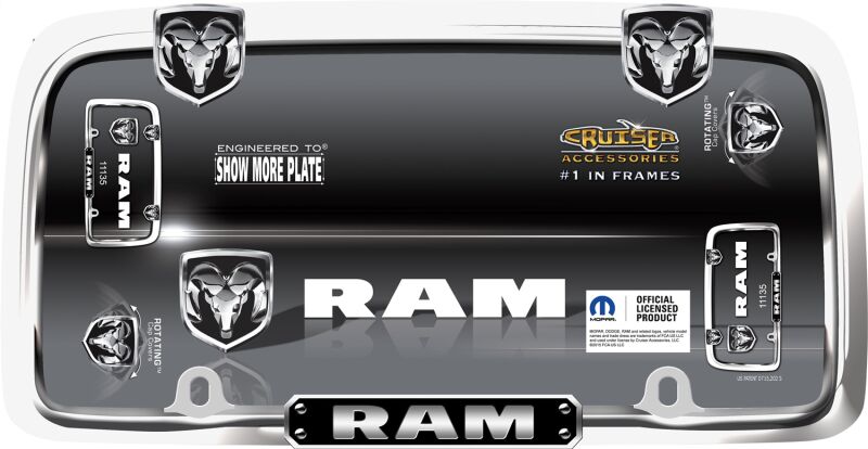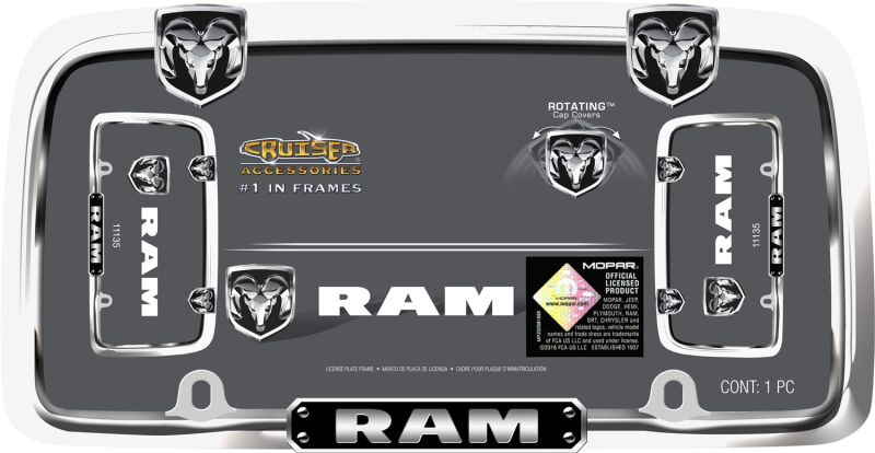Show off your Ram with this hand polished chrome plated frame accented by a brilliant black RAM logo and two (2) pivoting fastener caps
