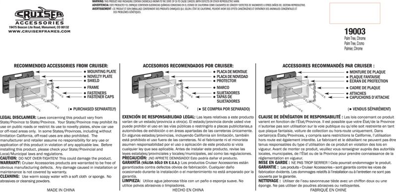 Cruiser Accessories is a family owned business that has been manufacturing and selling license plate frames for over 30 years. Through innovation, attention to detail and many patented designs, Cruiser has evolved into the largest supplier of license plate frames, novelty plate shields and mounting hardware in the automotive aftermarket. Cruiser's product line also includes both standard and exclusive Star Pin locking hardware, designer fastener caps, mounting accessories, motorcycle frames and 3d-Cals decals. Let Cruiser Accessories complete your ride's look today!