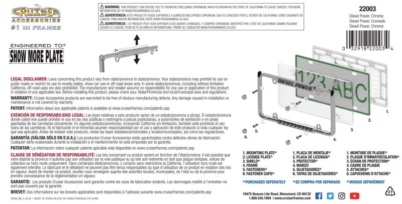 Cruiser Accessories is a family owned business that has been manufacturing and selling license plate frames for over 30 years. Through innovation, attention to detail and many patented designs, Cruiser has evolved into the largest supplier of license plate frames, novelty plate shields and mounting hardware in the automotive aftermarket. Cruiser's product line also includes both standard and exclusive Star Pin locking hardware, designer fastener caps, mounting accessories, motorcycle frames and 3d-Cals decals. Let Cruiser Accessories complete your ride's look today!