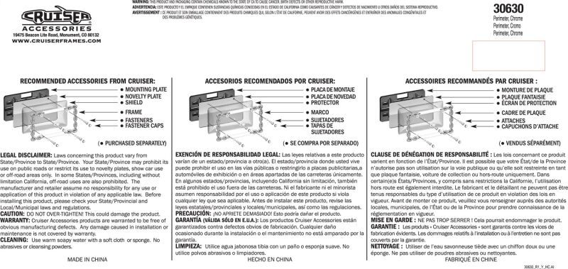 Cruiser Accessories is a family owned business that has been manufacturing and selling license plate frames for over 30 years. Through innovation, attention to detail and many patented designs, Cruiser has evolved into the largest supplier of license plate frames, novelty plate shields and mounting hardware in the automotive aftermarket. Cruiser's product line also includes both standard and exclusive Star Pin locking hardware, designer fastener caps, mounting accessories, motorcycle frames and 3d-Cals decals. Let Cruiser Accessories complete your ride's look today!