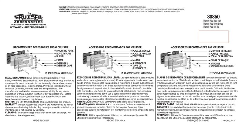 Cruiser Accessories is a family owned business that has been manufacturing and selling license plate frames for over 30 years. Through innovation, attention to detail and many patented designs, Cruiser has evolved into the largest supplier of license plate frames, novelty plate shields and mounting hardware in the automotive aftermarket. Cruiser's product line also includes both standard and exclusive Star Pin locking hardware, designer fastener caps, mounting accessories, motorcycle frames and 3d-Cals decals. Let Cruiser Accessories complete your ride's look today!