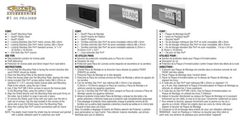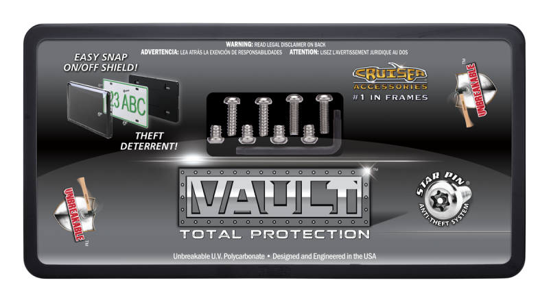 Cruiser Accessories is a family owned business that has been manufacturing and selling license plate frames for over 30 years. Through innovation, attention to detail and many patented designs, Cruiser has evolved into the largest supplier of license plate frames, novelty plate shields and mounting hardware in the automotive aftermarket. Cruiser's product line also includes both standard and exclusive Star Pin locking hardware, designer fastener caps, mounting accessories, motorcycle frames and 3d-Cals decals. Let Cruiser Accessories complete your ride's look today!