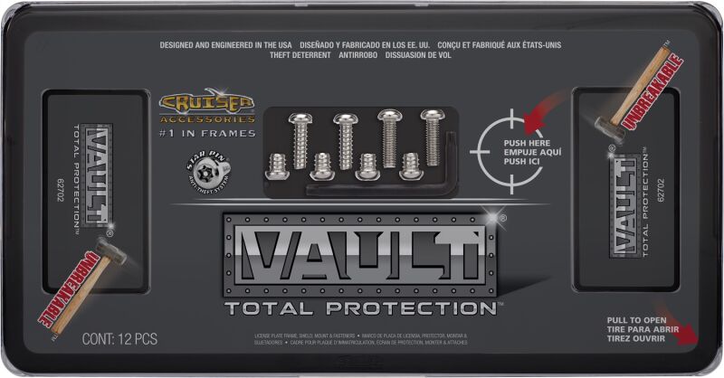 Cruiser Accessories Vault in Black/Smoke provides total protection for your license plate. The Vault is water-resistant and more important a theft deterrent! The unique and innovative patented design of the Vault includes three components plus Cruiser exclusive hardware: mounting plate, frame insert, and an unbreakable novelty plate shield.