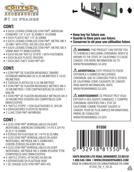 Cruiser Accessories is a family owned business that has been manufacturing and selling license plate frames for over 30 years. Through innovation, attention to detail and many patented designs, Cruiser has evolved into the largest supplier of license plate frames, novelty plate shields and mounting hardware in the automotive aftermarket. Cruiser's product line also includes both standard and exclusive Star Pin locking hardware, designer fastener caps, mounting accessories, motorcycle frames and 3d-Cals decals. Let Cruiser Accessories complete your ride's look today!