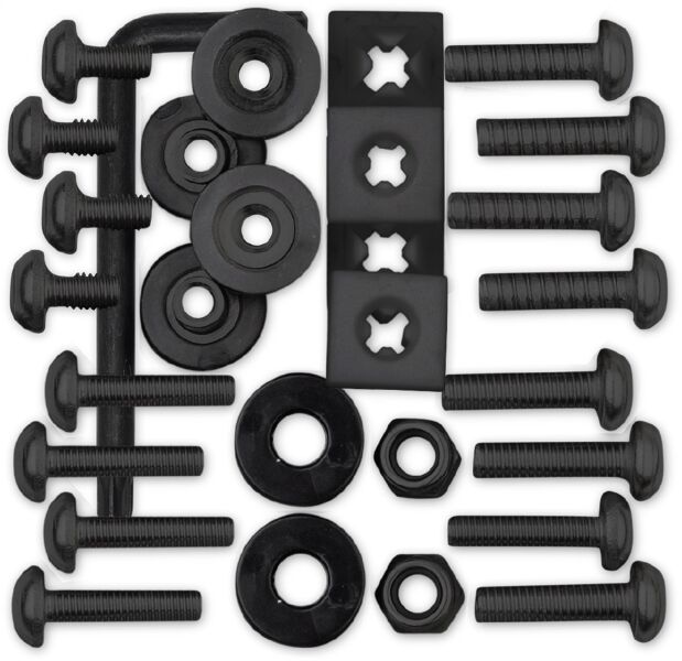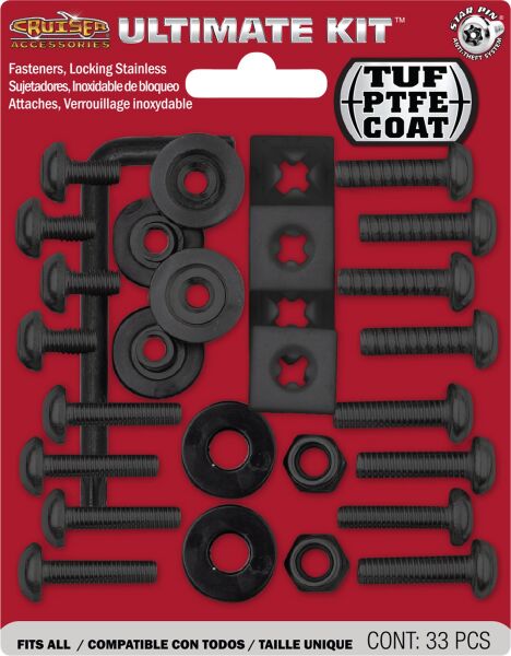 Cruiser Accessories Ultimate Locking Fasteners Kit in Black PTFE is the complete hardware solution to accommodate both standard and metric needs. Rattle Stop fasteners securely attach the license plate and frame together on the 2 lower fastener holes to prevent rattling.