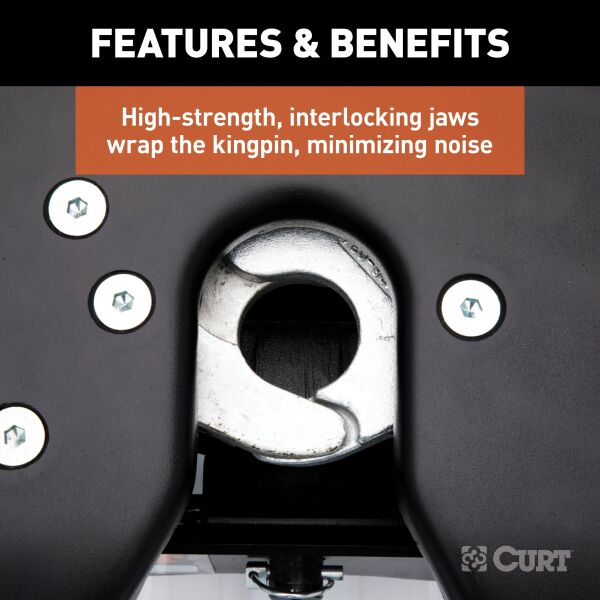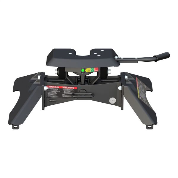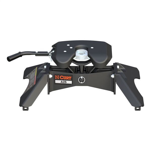 The CURT A25 5th wheel hitch offers smoother, quieter towing for your home-away-from-home, combining the patented technology of our A-series, an easier mounting system and the power of a 25K 5th wheel hitch. Like our A16 and A20 hitches, this 25K 5th wheel hitch uses a patented cast yoke to allow for unimpeded head movement, while providing exceptional stability for the trailer. The yoke has a set of poly-torsion inserts to suppress shock loads and reduce excessive noise, and the head features high-strength, interlocking jaws to give the trailer stability and the freedom to pivot and swivel as needed. The A25 5th wheel hitch is also engineered for easier installation. The legs are equipped with two pins to properly align with the mounting holes, and they have easy-access mounting bolts for ergonomic tightening. The 5th wheel head also has a fast, one-pin removal system to make installation and removal from the truck bed easier. This 25K 5th wheel mounts to any industry-standard 5th wheel rails, using the 5th wheel legs or a CURT 5th wheel roller. It can also be mounted into the puck system of a truck equipped with the towing prep package, using our OEM puck system legs or roller adapters. Once installed, the A25 is fast and simple to operate. It features an extra-wide head opening to increase the coupling area for the trailer, and it has a lockable, single-throw handle that self-resets to the ready-to-couple position after uncoupling. To make coupling even easier, it is equipped with a coupling indicator that is visible from the truck cab. The indicator shows the status of the connection and eliminates the need for you to check multiple times while coupling. To protect the A25 5th wheel hitch against rust, wear and whatever other threats might impede your cross-country tour, it comes with a black carbide powder coat finish and a limited lifetime warranty. We also test the A25 for safety in accordance with SAE J2638 to ensure reliability for the road ahead.