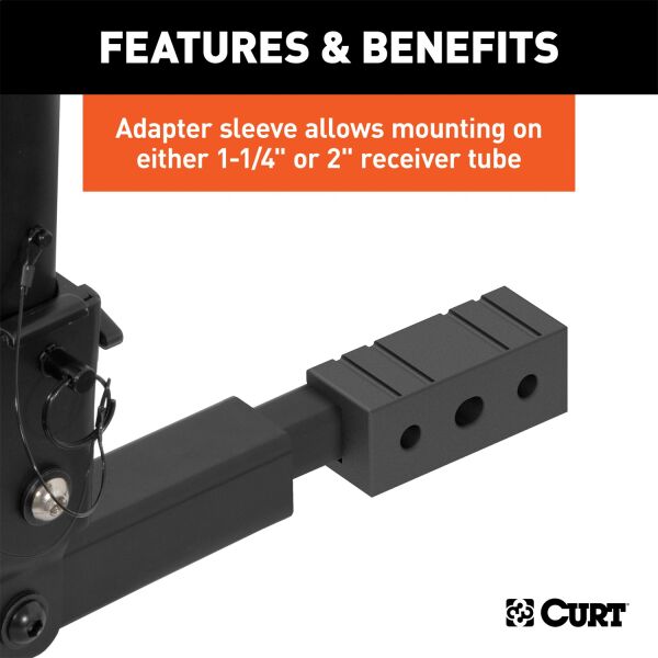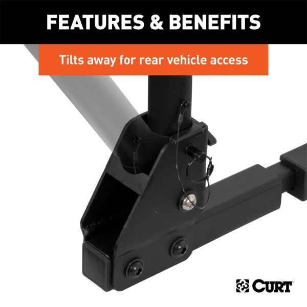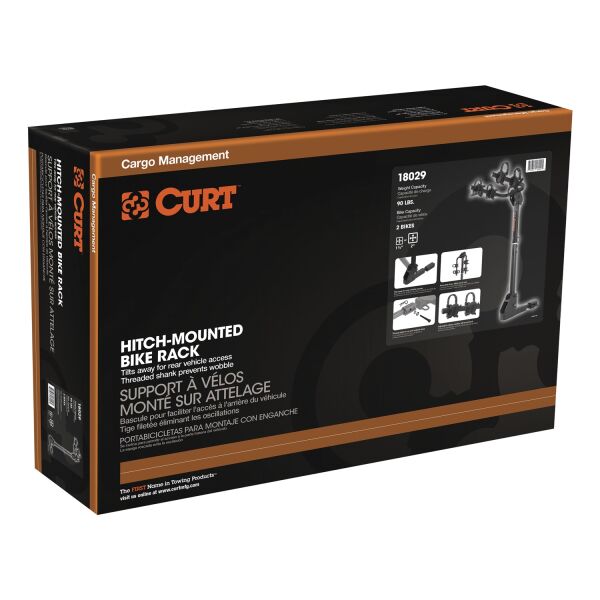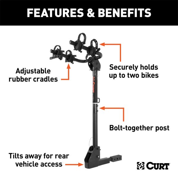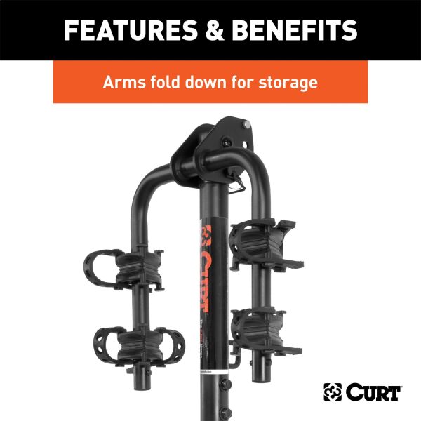Whether you are an avid mountain biker or a casual rider, you will want CURT along for the ride. CURT bike racks offer both versatility and quality and are available in several different styles to fit your needs. CURT standard hitch-mounted bike racks are anything but average. They feature an adjustable shank to fit either a 1-1/4" or 2" receiver and allow use on most trailer hitch classes. Our standard bike racks also come with several useful features, including an anti-wobble shank to reduce noise and keep bikes more secure, and a compact design for easy storage. They feature adjustable arms to accommodate various bike heights and styles, and the arms can be folded down, when not in use, to remain out of the way. The tilt-down design built into our standard bike racks allows you easier access to the rear of your vehicle whenever necessary. This particular CURT standard bike rack is able to hold up to two bikes and features a maximum load limit of 90 lbs. To protect it against the elements and the trail ahead, this bike rack comes with a durable black powder coat finish.