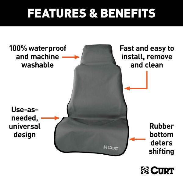 The CURT Seat Defender car seat cover is a universal, use-as-needed seat cover protection system that readily installs whenever you need it. It provides an instant defense against dirt, spills, pet dander and any other threats to your vehicle's interior. What makes it unique is its use-as-needed design. Rather than being a permanent cover-up for unsightly interior that has already been damaged, Seat Defender seat covers act as a barrier to prevent the damage before it happens. Unlike seat covers that require tedious installation, the Seat Defender is designed to be easy to put on and take off, whenever needed. It attaches securely to the headrest and conforms to the shape of the seat, giving the seat a tough, waterproof outer layer. CURT Seat Defender seat coverings are also easy to store and keep clean. Because it is not a permanent seat cover, it is designed for fast cleanup, fast foldup and fast installation the next time you need it. It easily protects against wet clothes, dirty tools, muddy sports equipment, shedding pets, sandy swimsuits, messy fast food and more. It is also 100% machine washable and can be stored in any small compartment in your vehicle. The CURT Seat Defender is made out of a two-sided material to provide a sophisticated barrier against potential threats. The underside is a layer of water-resistant thermoplastic rubber (TPR). TPR is durable and wear-resistant and provides added comfort and safety by gripping the surface of the seat. The top side is a woven 600-denier terylene fabric that keeps dirt and spills out and maintains comfort for the user. Seat Defenders are the perfect seat covers for cars, trucks, minivans, SUVs and more. They're great for pet owners, outdoor enthusiasts, sports lovers, industrial and commercial workers, frequenters of the beach or boat landing and many others. They also make great baby car seat covers!