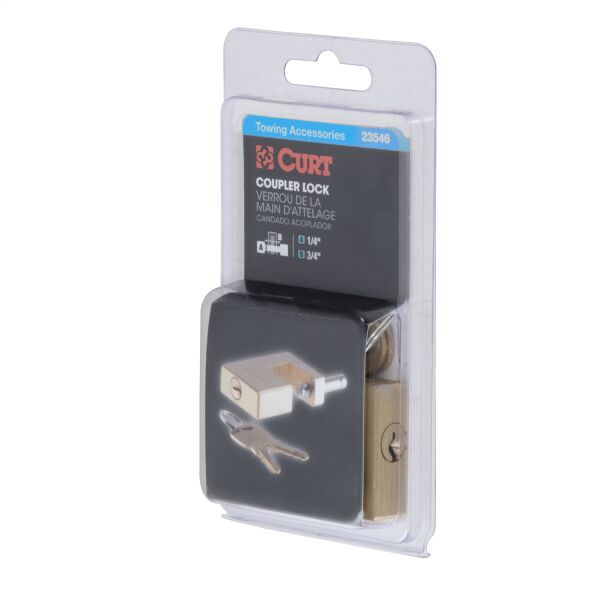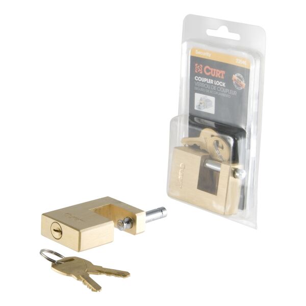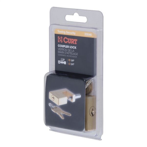 Sometimes a safety pin and coupler latch are just not enough to keep your toys safe. While CURT safety pins and coupler latches are made to keep your coupler securely latched onto your trailer ball, they are no substitute for the locking power provided by a CURT coupler lock. CURT coupler locks are designed to add security to your trailer and towing equipment. Instead of merely retaining the coupler latch mechanism, they lock it into place and greatly deter any tampering and theft of your trailer while it is coupled to your vehicle. CURT coupler locks are key-operated and come in several different styles for you to choose from. This coupler lock features a compact design to keep the pin well protected from tampering. It comes with a solid brass finish and offers a pin span of 3/4" with a pin diameter of 1/4". All CURT coupler locks are made to fit latch-type couplers and include two keys. Protect your boat, your camper and even your utility trailer the right way with a CURT coupler lock.