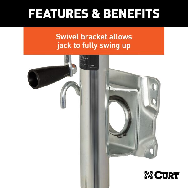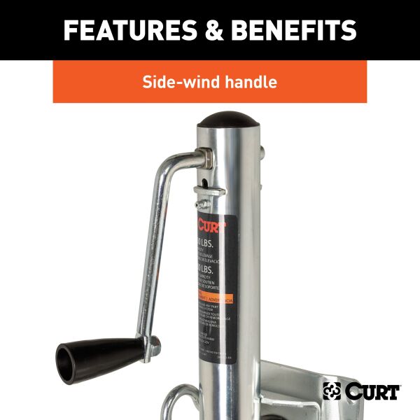 In our goal of being your best source for all things towing, the CURT line of trailer jacks is designed with care and manufactured with pride. CURT jacks are made with quality to promote the life and function of your trailer, and they come in several different styles to accommodate your needs, whether you are a frequenter of the boat landing, the campground, the racetrack or the field. Designed to withstand the wear and tear of frequent water exposure, CURT marine jacks are the jack of choice for the avid fisherman or boating enthusiast. Our marine jacks have a few features that make them a special addition to our trailer jack line. Unlike any of our other jacks, CURT marine trailer jacks are equipped with wheels, allowing for greater mobility and easier coupling of your trailer. Choose from models with one or two wheels. Marine jacks also have a pull-pin that allows them to pivot on their mounting bracket to be out of the way for travel. To protect them from corrosion and the damage of moisture, these jacks come with a zinc finish. This CURT marine jack features a support capacity of 1,000 lbs., a lift capacity of 1,000 lbs., a travel of 10" and a wheel diameter of 6". It comes with a side-wind handle and all the necessary bolt-on hardware for a complete installation. It does not matter what kind of trailer you tow -- a boat trailer, utility trailer, livestock hauler or recreational vehicle trailer -- if you have a receiver-style trailer, you will want a jack that complements its function. For a trailer jack that will not steer you wrong, CURT has the answer.