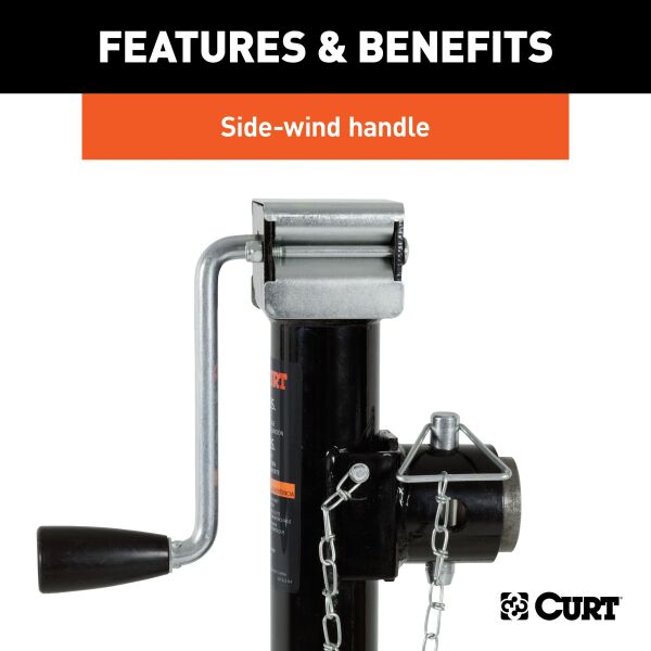 In our goal of being your best source for all things towing, the CURT line of trailer jacks is designed with care and manufactured with pride. CURT jacks are made with quality to promote the life and function of your trailer, and they come in several different styles to accommodate your needs, whether you are a frequenter of the boat landing, the campground, the racetrack or the field. CURT swivel jacks get their name from the pull-pin swivel feature that allows the jack to pivot on its mounting bracket and swing up and out of the way for travel. Our swivel trailer jacks are broken into two categories: pipe mount and bracket mount. This CURT pipe mount swivel jack features a support capacity of 5,000 lbs., a lift capacity of 3,000 lbs. and a travel of 15". With a jack foot plate welded on the bottom, this type of jack also provides added stability for your trailer on rough terrain. It comes with a side-wind handle and includes a weldable pipe with a 5/8" hole for secure mounting. It does not matter what kind of trailer you tow -- a boat trailer, utility trailer, livestock hauler or recreational vehicle trailer -- if you have a receiver-style trailer, you will want a jack that complements its function. For a trailer jack that will not steer you wrong, CURT has the answer.