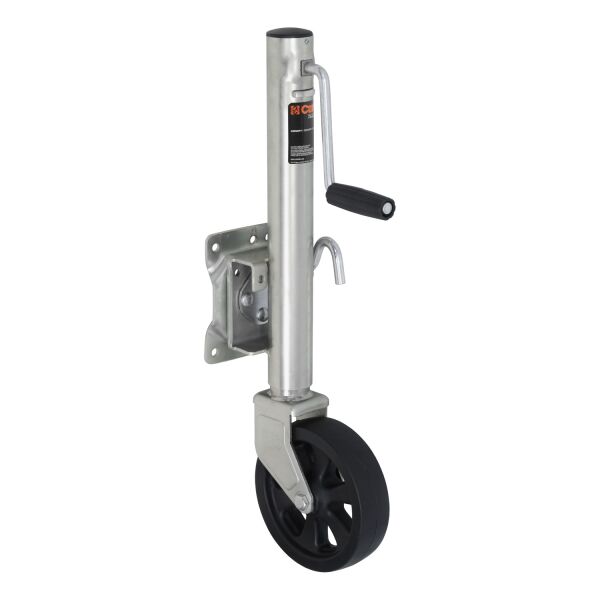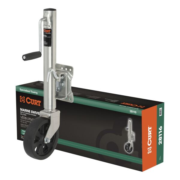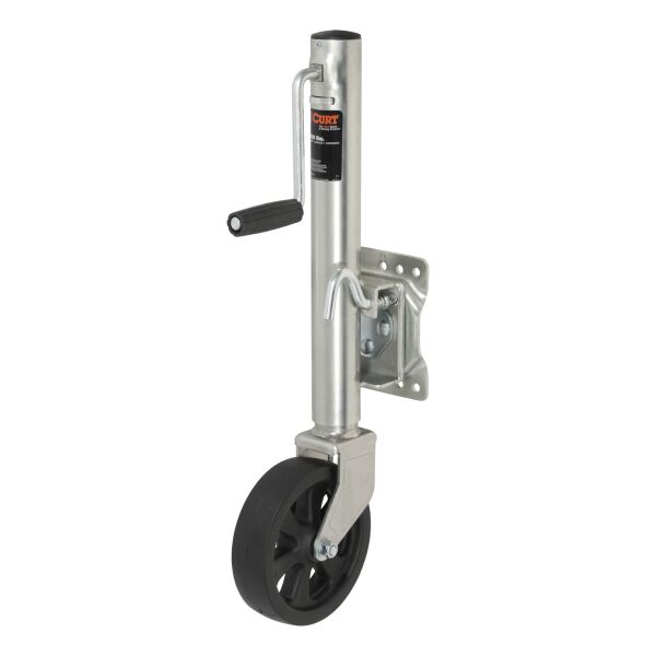 In our goal of being your best source for all things towing, the CURT line of trailer jacks is designed with care and manufactured with pride. CURT jacks are made with quality to promote the life and function of your trailer, and they come in several different styles to accommodate your needs, whether you are a frequenter of the boat landing, the campground, the racetrack or the field. Designed to withstand the wear and tear of frequent water exposure, CURT marine jacks are the jack of choice for the avid fisherman or boating enthusiast. Our marine jacks have a few features that make them a special addition to our trailer jack line. Unlike any of our other jacks, CURT marine trailer jacks are equipped with wheels, allowing for greater mobility and easier coupling of your trailer. Choose from models with one or two wheels. Marine jacks also have a heavy-duty pull-pin that allows them to pivot on their mounting bracket to be out of the way for travel. To protect them from corrosion and the damage of moisture, these jacks come with a zinc finish. This CURT marine jack features a weight capacity of 1,500 lbs., a travel of 10" and a wheel diameter of 8". It comes with a side-wind handle and all the necessary bolt-on hardware for a complete installation. It does not matter what kind of trailer you tow -- a boat trailer, utility trailer, livestock hauler or recreational vehicle trailer -- if you have a receiver-style trailer, you will want a jack that complements its function. For a trailer jack that will not steer you wrong, CURT has the answer.