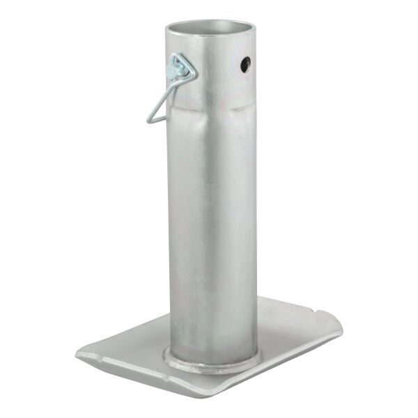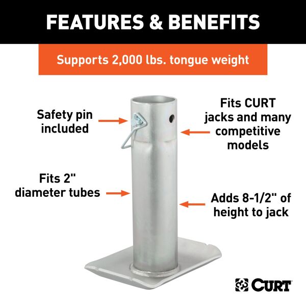 In our goal of being your best source for all things towing, the CURT line of trailer jacks is designed with care and manufactured with pride. CURT jacks are made with quality to promote the life and function of your trailer, and they come in several different styles to accommodate your needs, whether you are a frequenter of the boat landing, the campground, the racetrack or the field. Add stability and support to your trailer jack and trailer with a CURT jack foot. This hardy steel jack attachment features a simple safety pin mounting system and can be used on a number of CURT jacks and many competitive models. It measures 8-1/2" tall, has a weight capacity of 2,000 lbs. and is designed for 2" diameter tubes. It does not matter what kind of trailer you tow -- a boat trailer, utility trailer, livestock hauler or recreational vehicle trailer -- if you have a receiver-style trailer, you will want a jack that complements its function. For a trailer jack that will not steer you wrong, CURT has the answer.