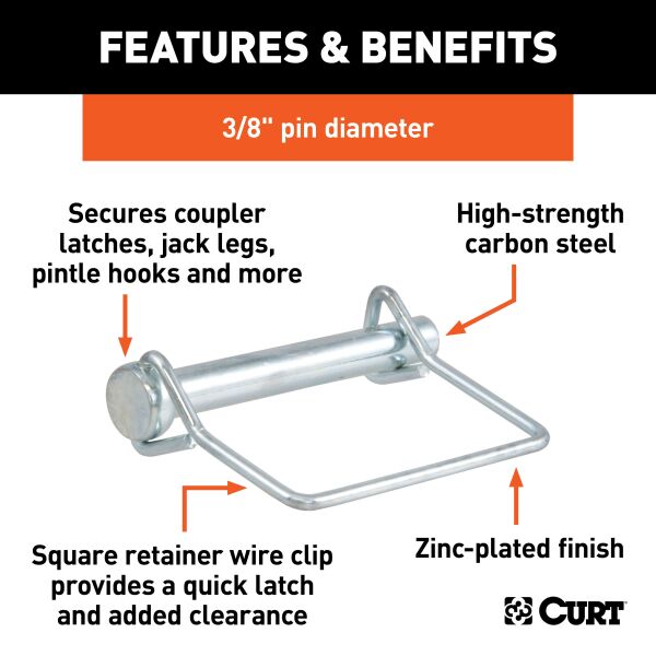 CURT safety pins go beyond the simple function of keeping your coupler latch secure. They are constructed from quality materials and have a universal design that allows them be used for a variety of purposes in your towing setup. CURT safety pins are made from solid steel to provide more than enough strength to keep your trailer coupler latched down tight. The zinc plating that we use to finish our safety pins offers excellent protection against rust and corrosion. This is necessary for any trailer because of its frequent exposure to the elements. The user-friendly design of our safety pins allows them to be easily handled while maintaining effective security. This safety pin has a pin diameter of 3/8". CURT safety pins can also be purchased with a 12" chain attachment to mount onto your trailer coupler and prevent the safety pin from being misplaced. Use CURT safety pins for securing trailer couplers, jacks, caster wheels and more. When you couple your trailer to your vehicle, nuts and bolts just do not cut it. Secure your towing equipment right with a safety pin from CURT.