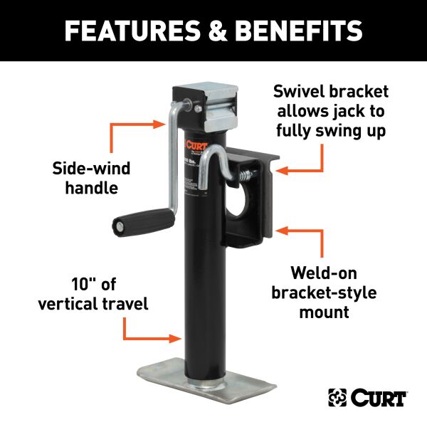 In our goal of being your best source for all things towing, the CURT line of trailer jacks is designed with care and manufactured with pride. CURT jacks are made with quality to promote the life and function of your trailer, and they come in several different styles to accommodate your needs, whether you are a frequenter of the boat landing, the campground, the racetrack or the field. CURT swivel jacks get their name from the pull-pin swivel feature that allows the jack to pivot on its mounting bracket and swing up and out of the way for travel. Our swivel trailer jacks are broken into two categories: pipe mount and bracket mount. This CURT bracket mount swivel jack features a support capacity of 3,000 lbs., a lift capacity of 2,000 lbs. and a travel of 10". With a jack foot plate welded on the bottom, this type of jack provides added stability for your trailer on rough terrain. It comes with a side-wind handle and has a weldable bracket for secure mounting. It does not matter what kind of trailer you tow -- a boat trailer, utility trailer, livestock hauler or recreational vehicle trailer -- if you have a receiver-style trailer, you will want a jack that complements its function. For a trailer jack that will not steer you wrong, CURT has the answer.