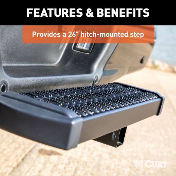 The CURT Grip Step receiver hitch step is the perfect way to add a convenient and highly useful step up into your vehicle, utilizing your trailer hitch. It quickly and securely installs into any standard 2-inch x 2-inch receiver hitch and provides a high-traction 26-inch x 7-inch stepping surface (hitch pin included). The Grip Step aluminum hitch step can be used on the front of the vehicle for maintenance or at the rear for accessing the truck bed or cargo area. This receiver hitch step is constructed from powder-coated aluminum to be highly weather-resistant and non-corrosive. The expanded aluminum treads provide unparalleled traction, locking onto your shoe or boot and actively resisting slips and skids. The metal design is also extremely durable, and the open treads allow dirt and debris to pass through the step, keeping it clean for future use.