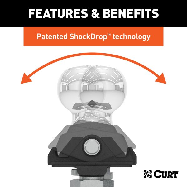 The CURT RockerBall trailer ball is a cushion hitch ball that dynamically absorbs jerking and jarring from your trailer at the coupling point. Just bolt it onto your existing trailer hitch ball mount to enjoy increased comfort, enhanced control and extended longevity of your vehicle's systems. The RockerBall tow ball is engineered with ShockDrop technology: a cushion isolator that reduces noise, vibrations and chucking at the coupling point. This produces quieter towing, increased driver control over the trailer and reduced strain on the vehicle's brakes, towing system and suspension, compared to a conventional metal-on-metal towing connection. The RockerBall fits onto a variety of standard ball mounts -- virtually any ball mount with a 2-1/2-inch wide trailer ball tongue and 1-inch diameter ball hole. RockerBall is also virtually maintenance-free. Unlike other cushion hitch and torsion hitch options, it has no airbags or bearings to service. Just apply grease to the zerk fitting as needed for continuous lubrication and smooth towing. The RockerBall trailer ball is constructed from forged steel for exceptional strength, and it comes with a powder coat finish and chrome plating for dependable corrosion resistance.