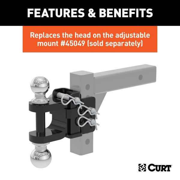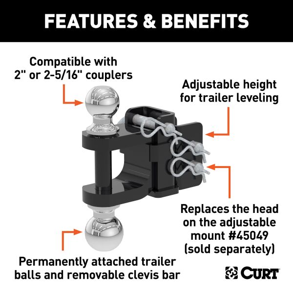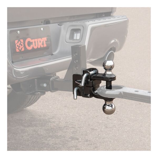 If you own multiple trailers or frequently tow a variety of loads, you know how much time and money are spent tailoring your towing system to each and every individual trailer. There is nothing more inconvenient than switching back and forth between a few different ball mounts and trying to remember which mount fits with which trailer. A CURT adjustable ball mount is your multipurpose towing solution. This CURT adjustable ball mount fits an adjustable shank size of 2" x 2" and features two different trailer ball sizes to accommodate two different coupler sizes: 2" and 2-5/16". The 2" trailer ball offers a gross trailer weight capacity of 7,500 lbs. and a tongue weight capacity of 750 lbs., while the 2-5/16" ball offers 10,000 lbs. GTW and 1,000 lbs. TW. This allows you to easily tow a variety of heavyweight trailers and to ensure that each one tows smoothly and securely. It includes three 5/8" hitch pins for quick and secure installation, and comes equipped with a clevis bar to accept a lunette ring. All CURT adjustable ball mounts are made with sturdy steel construction and come with a durable powder coat finish for long-lasting rust, scratch and UV resistance.