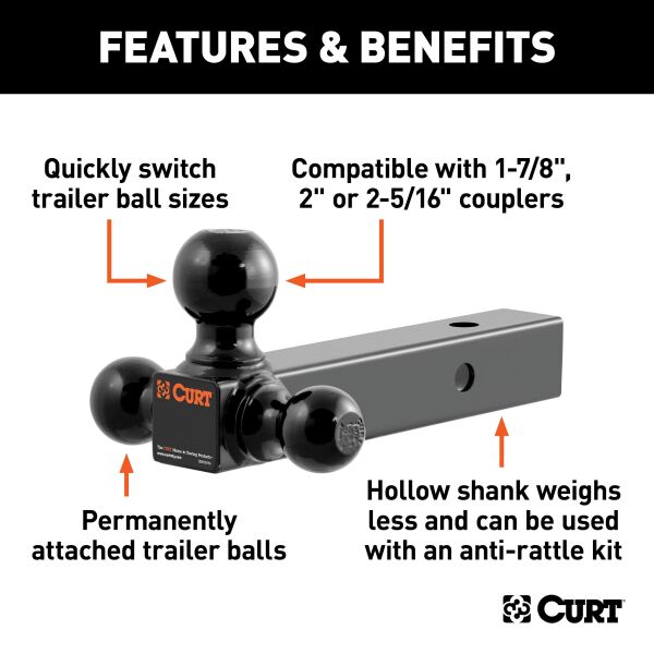 If you own more than one trailer, you know what a hassle it can be switching back and forth between ball mounts and keeping track of which ball mount fits which coupler. CURT has made things simpler with the multi-tow ball mount. These ball mounts feature two or three trailer balls mounted onto a straight shank to accommodate various coupler sizes and loads. This multi-ball ball mount features a 1-7/8", a 2" and a 2-5/16" ball. The 1-7/8" trailer ball can tow up 5,000 lbs. of gross trailer weight and 500 lbs. of tongue weight. The 2" ball can handle 7,500 lbs. of GTW and 750 lbs. of TW, and the 2-5/16" ball accepts loads up to 10,000 lbs. with 1,000 lbs. of TW. This multipurpose ball mount also features a dual-length option and has a hollow shank to accept an anti-rattle kit. All of our multi-use ball mounts come with a gloss black powder coat finish and a 2" x 2" shank. CURT multi-tow ball mounts are an obvious choice for anyone who tows more than one trailer on a regular basis. The multiple-ball design allows for quick changes between ball sizes without needing to install or own an entirely different ball mount. Because the balls are permanently welded to the shank, these ball mounts are also very secure, eliminating the possibility of a ball coming loose and deterring any potential theft.