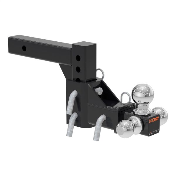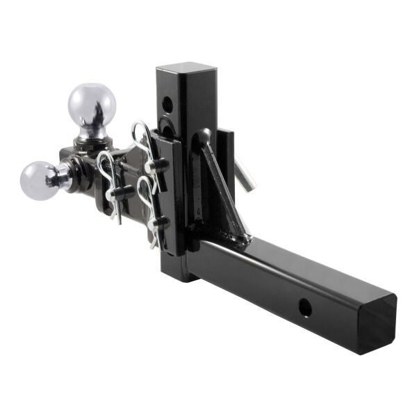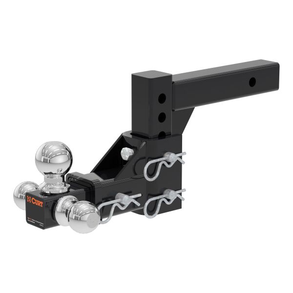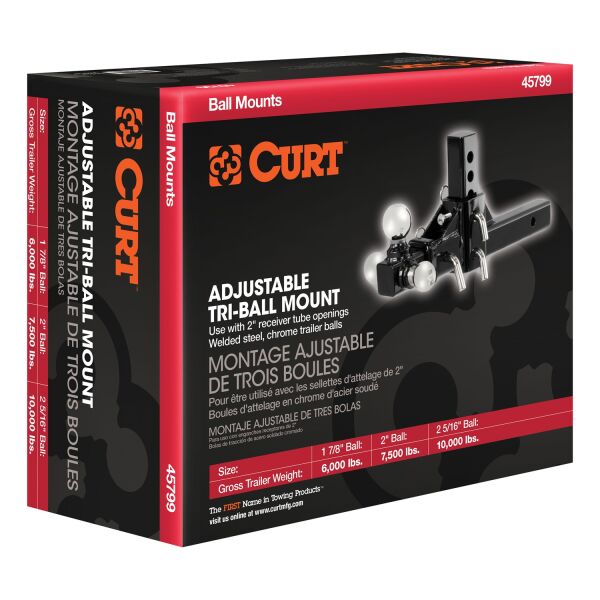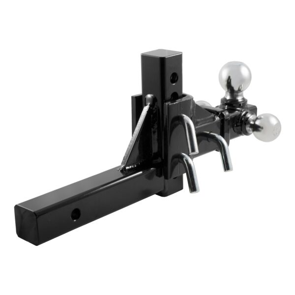If you own multiple trailers or frequently tow a variety of loads, you know how much time and money are spent tailoring your towing system to each and every individual trailer. There is nothing more inconvenient than switching back and forth between a few different ball mounts and trying to remember which mount fits with which trailer. A CURT adjustable ball mount is your multipurpose towing solution. This CURT adjustable ball mount has a shank size of 2" x 2" and features three different trailer ball sizes to accommodate all standard coupler sizes: 1-7/8", 2" and 2-5/16". The 1-7/8" trailer ball offers a gross trailer weight capacity of 6,000 lbs. and a tongue weight capacity of 600 lbs. The 2" trailer ball has a GTW capacity of 7,500 lbs. and a TW capacity of 750 lbs., and the 2-5/16" ball offers 10,000 lbs. GTW and 1,000 lbs. TW. This allows you to easily tow a variety of trailers and to ensure that each one tows smoothly and securely. This tri-ball ball mount also features an adjustable shank assembly with multiple mounting holes for varying ball heights. Each trailer ball can be raised to a maximum of 5-3/4" rise or lowered to a maximum of 5-3/4" drop, allowing you to make your trailer completely level in any towing situation. It includes three 5/8" hitch pins for quick and secure installation, and the adjustable shank can also be used with our multipurpose ball mount attachment #45008 for even more versatility. All CURT adjustable ball mounts are made with sturdy steel construction and come with a durable powder coat finish for long-lasting rust, scratch and UV resistance.