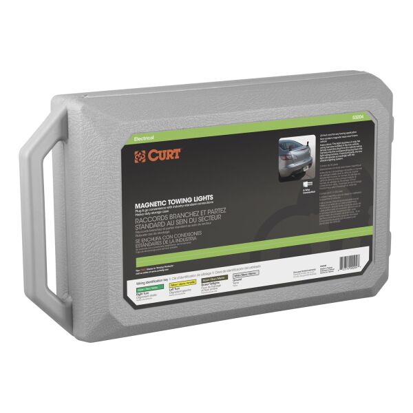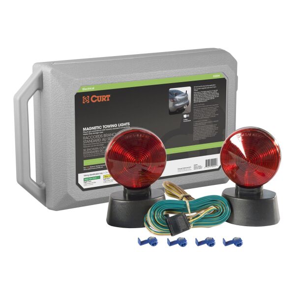 CURT magnetic tow lights are the safe, convenient trailer light solution when dinghy towing a vehicle. These auxiliary lights easily splice into your vehicle's wiring system using the included snap-locks, and they provide a standard 4-way flat connector to plug into the socket on your RV or truck. 20 feet of wiring offers more than enough length to accommodate virtually any compact car, sedan or other towed vehicle. CURT towing lights also feature non-scratch, magnetic bases to be mounted on any vehicle without the worry of damaging the finish. The magnets are strong and easily withstand wind, weather and harsh other road conditions. Whether you prefer a tow bar or tow dolly, if you dinghy tow, CURT offers plug-and-go convenience and a reliable connection with our magnetic trailer light kit. This package includes two lamps and all necessary installation hardware.