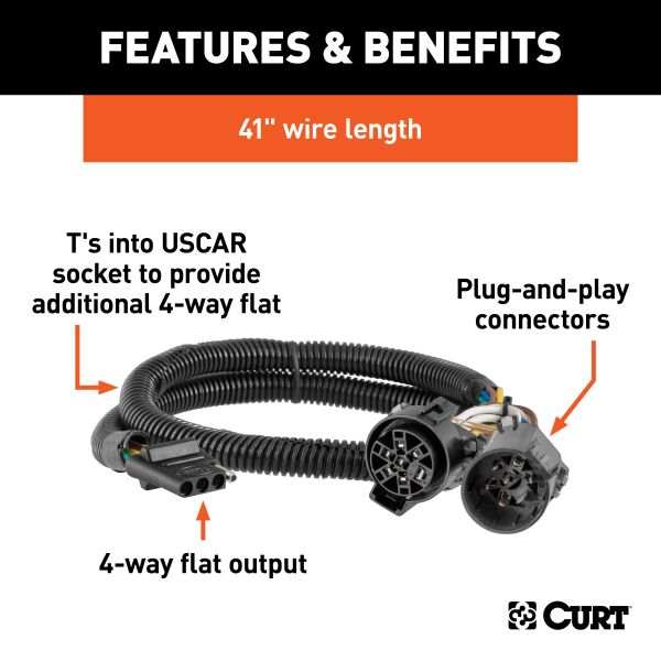 Stress is the last thing you should feel when towing a trailer -- whether you're hauling your RV to that favorite camping destination, your ATVs up to the hunting grounds or your fishing boat to the new hidden hotspot. At CURT, we think your towing equipment should add to the enjoyment of your experience, not detract from it. CURT custom wiring connectors are the easiest way to outfit your vehicle with a CURT trailer wiring connection. They are built with some of the most advanced technology in the industry, and each one is custom-fitted to work with a specific make and model. Some automotive manufacturers install a special socket on the vehicle to be used for vehicle-to-trailer wiring. Though this special socket is not equipped on every vehicle, a CURT custom wiring connector (also called a T-connector) utilizes the socket for simple, stress-free installation. Rather than requiring you to cut, splice and solder into your vehicle's wiring system, the custom wiring connector uses a single OEM-compatible plug and instantly provides a standard vehicle-to-trailer wiring connection, typically in the form a 4-way flat. All CURT custom wiring connectors are made vehicle-specific for the easiest possible installation and the best fit. This particular connector provides a 4-way flat socket while retaining use of the existing OEM socket. It is designed to be a custom wiring option for a variety of vehicles (see application info to verify fitment with your vehicle). It comes with a dust cover to keep the connector socket clean when not in use.