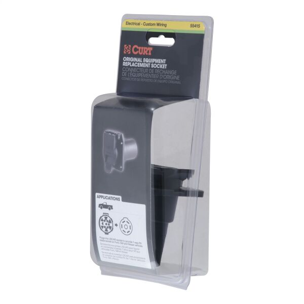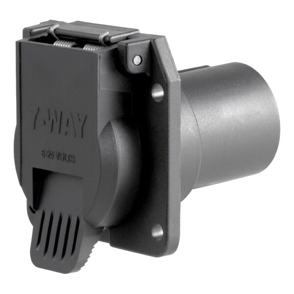 Like trailer hitches and ball mounts, electrical connectors range all over the board in shape, size and capability, but no matter what your trailer's electrical functions are, you need a solid connection to keep the power flowing and ensure safety on the road. CURT electrical connectors are designed and manufactured to give you a reliable connection every time you plug in your trailer. This 7-way RV blade connector is designed to plug into a USCAR socket and supply power for tail lights, turn signals, electric trailer brakes, a 12-volt battery, reverse lights and brake lights, as well as a ground connection. It is intended to be a replacement trailer connector, plugging into a standard USCAR socket (see application info to verify fitment with your vehicle). It features rust-free black plastic construction and comes with a spring-loaded cover to keep out dust and water. This 7-way RV blade connector is a female-end socket, specifically designed for the vehicle side of the connection.