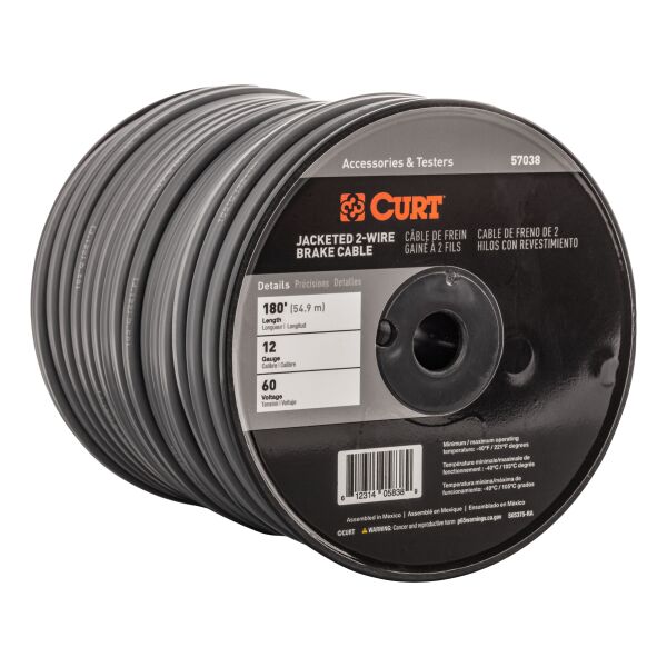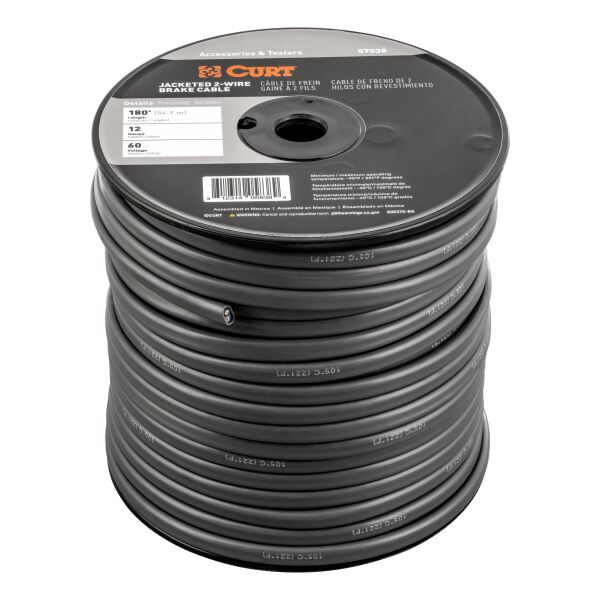 Designed for use with electric brake systems on trailers, CURT 2-Wire Trailer Brake Cable features two 12-gauge wires (black/blue) in a black protective jacket. Brake cable meets J-1128 specifications and includes 180' in a bulk spool.