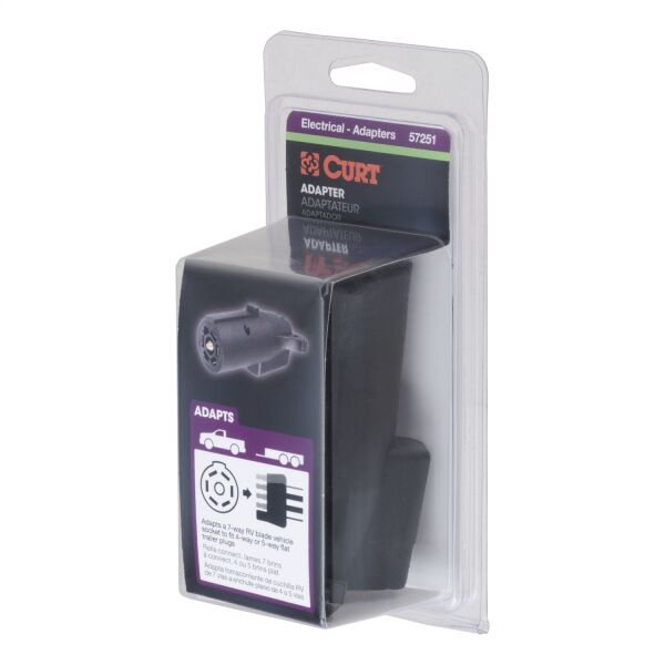 There are several different types of connectors used to supply power from a tow vehicle's electrical system to a trailer's wiring system. Some trailers only need the bare essentials -- running lights, brake lights and turn signals -- while others require a connection for reverse lights, electric brakes and auxiliary power. With connectors ranging from simple to complex, it may be the case that the connection between your vehicle and your trailer is not a perfect match. For example, your truck may be equipped with a 6-way round socket, but your trailer may have a 4-way flat plug. For this very common problem, CURT offers a quick and simple solution in the form of an electrical adapter. An adapter is an electrical device that allows a connection to be made between a mismatched trailer plug and vehicle socket. It easily plugs in your vehicle's electrical socket and usually requires no additional wiring. CURT offers an array of adapters to accommodate most types of plugs and sockets, including 4-way flat, 4-way round, 5-way flat, 6-way round, 7-way RV blades and more. This electrical adapter is designed to adapt a 7-way RV blade vehicle socket to fit a 5-way flat trailer plug. It features quality plastic construction and requires no splicing. All CURT wiring and electrical products come with a one-year limited warranty to give you the assurance you need to tow with confidence.