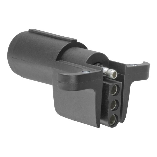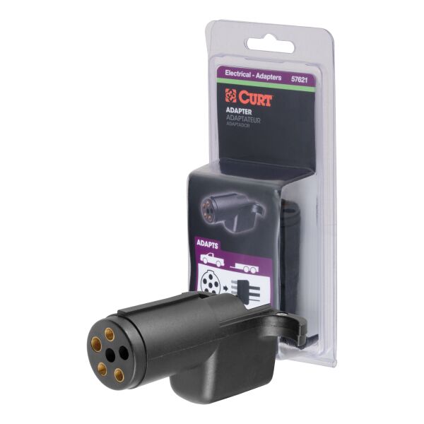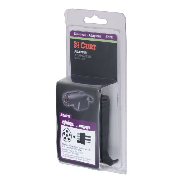 There are several different types of connectors used to supply power from a tow vehicle's electrical system to a trailer's wiring system. Some trailers only need the bare essentials -- running lights, brake lights and turn signals -- while others require a connection for reverse lights, electric brakes and auxiliary power. With connectors ranging from simple to complex, it may be the case that the connection between your vehicle and your trailer is not a perfect match. For example, your truck may be equipped with a 6-way round socket, but your trailer may have a 4-way flat plug. For this very common problem, CURT offers a quick and simple solution in the form of an electrical adapter. An adapter is an electrical device that allows a connection to be made between a mismatched trailer plug and vehicle socket. It easily plugs in your vehicle's electrical socket and usually requires no additional wiring. CURT offers an array of adapters to accommodate most types of plugs and sockets, including 4-way flat, 4-way round, 5-way flat, 6-way round, 7-way RV blades and more. This electrical adapter is designed to adapt a 6-way round vehicle socket to fit a 4-way flat trailer plug. It features quality plastic construction and requires no splicing. All CURT wiring and electrical products come with a one-year limited warranty to give you the assurance you need to tow with confidence.