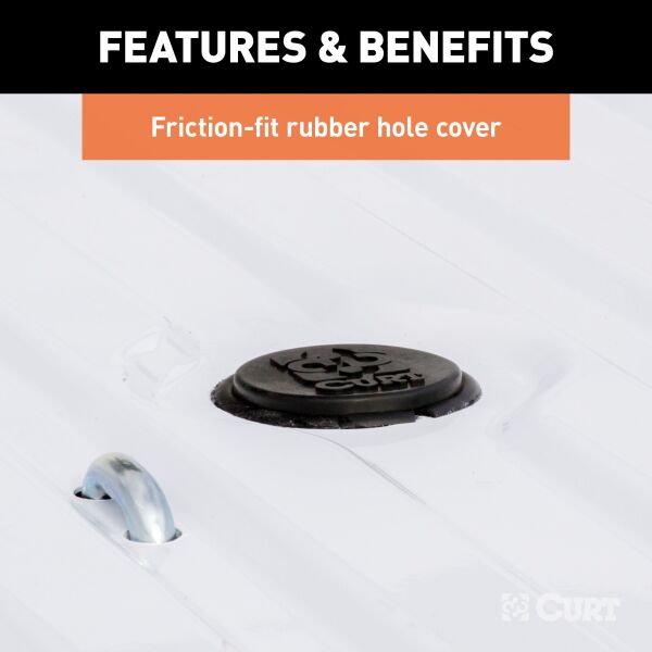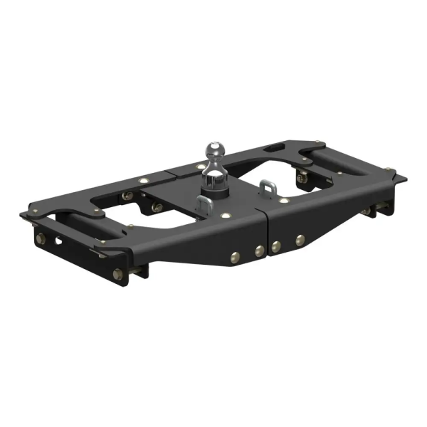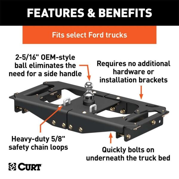 - they were the inspiration for the CURT OEM-style gooseneck hitch for Ford. This hitch is built to excel in two key things: ease of installation that comes from an ingenious design and safe, reliable towing even with heavy-duty gooseneck trailers. The Ford-compatible gooseneck hitch boasts a one-person installation. It is built with fewer pieces than competitor hitches to keep installation simple, and the pieces are designed to be compact so they can be lifted and bolted into place without the help of a second person. We've also eliminated a number of steps from the process to speed up installation time and reduce the number of modifications needed on the vehicle. The hitch does not require the exhaust or spare tire to be lowered. It requires no welding, temporary truck bed removal or even bed flange trimming. Best of all, pre-existing factory holes are used to mount the hitch to the truck's frame, meaning the only drilling necessary is for the gooseneck ball hole and safety chains in the truck bed. Once installed, the OEM-style gooseneck hitch for Ford offers simple operation and highly secure towing. It is tested in accordance with SAE J2638 to safely tow up to 38,000 lbs. GTW. Instead of a side handle mounted under the wheel well, it uses a latch-locking trailer ball. This patented 2-5/16" ball easily drops into the gooseneck head from above the truck bed and is secured in place with a simple quarter-turn of the latch. This Ford Super Duty gooseneck hitch also features heavy-duty 5/8" safety chain anchors for dependable security for your trailer, whether you're towing livestock, machinery or construction materials. To ensure maximum quality, the CURT OEM-style gooseneck hitch for Ford comes with a tough A-coat finish to easily resist rust and scratches.