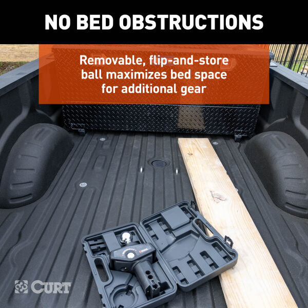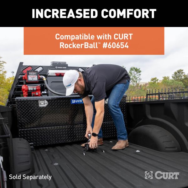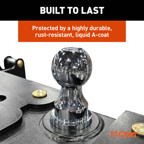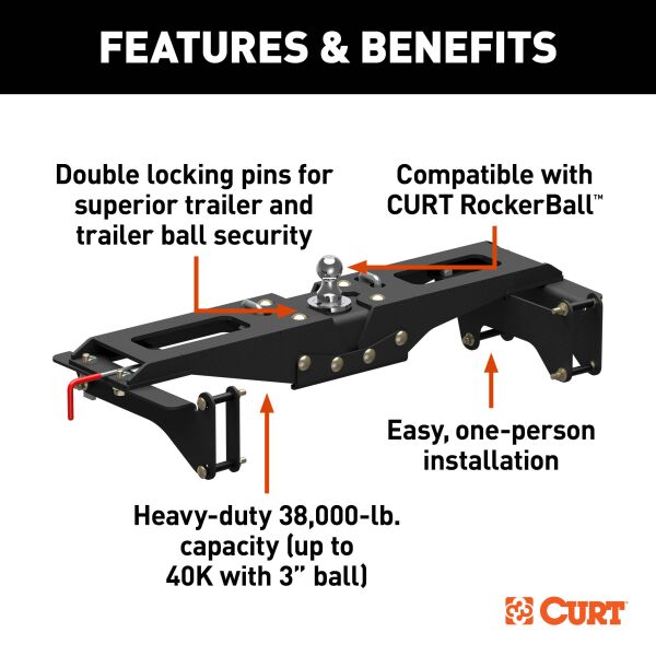 Experience powerful, reliable towing with the CURT PowerHaul™ Double Lock Gooseneck Hitch. Built for both professional haulers and weekend adventurers, this hitch delivers heavy-duty performance, making every towing job safer, smoother, and more controlled. Capable of handling up to 38,000 lbs. GTW and 9,500 lbs. vertical load with the included 2-5/16" ball and up to 40,000 lbs. GTW and 10,000 lbs. vertical load when paired with the optional 3" ball (#60694), the PowerHaul is ready for heavy trailers, construction equipment, and livestock transport. Installation is simple and designed for a single person, requiring no lowering of exhaust or spare tire, no welding, and no bed removal. The center locator system guarantees precise ball placement, so every hitching operation is safe, accurate, and worry-free. Security and convenience are at the forefront of the design. Double locking pins protect both the trailer and the ball, while the removable flip-and-store ball frees up truck bed space for gear, tools, or recreational equipment. The heavy-duty 3/8" handle and spring-loaded 5/8" safety chain loops provide dependable, long-lasting performance on every journey. Built to last, the PowerHaul meets SAE J2638 safety standards, features a rust-resistant liquid A-coat finish, and is proudly designed, welded, and coated in Wisconsin. With a limited lifetime warranty (one year on finish and parts), this double-lock gooseneck hitch gives you the strength and confidence to take on your toughest towing projects, whether you’re hitting the job site, transporting livestock, or cruising the open road with your trailer in tow.