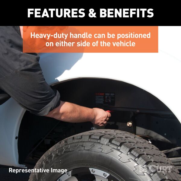 - Heavy-duty handle can be positioned on either side of the vehicle