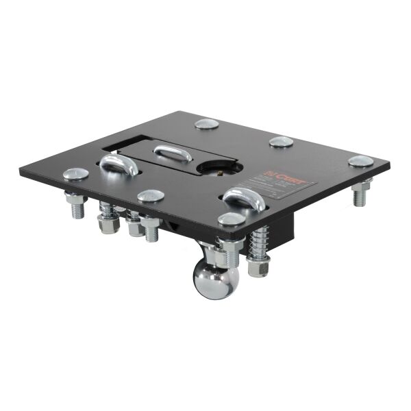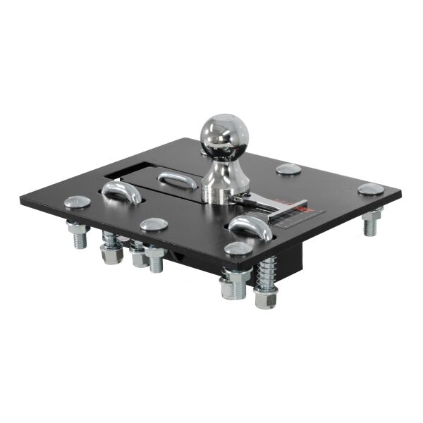The CURT folding ball gooseneck hitch is an innovation in gooseneck technology, offering a unique solution to the problem of a misplaced or stolen trailer ball. Rather than having a fixed trailer ball that obstructs your truck bed space or a removable ball that locks into place using a set of pins, a folding ball gooseneck hitch features a permanently attached ball that hinges down into a small compartment within the hitch. When folded down, the gooseneck ball remains out of the way and allows you to make full use of your truck bed. When folded back up again, it provides a reliable towing connection for your gooseneck trailer. No matter which position the ball is in, it remains fixed to your pickup truck, deterring theft and preventing loss. The CURT over-bed folding ball gooseneck hitch is just another example of CURT quality and ease of use. This durable hitch has a gross trailer weight capacity up to 30,000 lbs. and a tongue weight capacity of 7,500 lbs. A 2-5/16" trailer ball, 3/8" thick top plate, six-hole mounting design and U-bolt safety chain hookups ensure that your trailer and payload stay securely attached. The folding mechanism of the over-bed folding ball gooseneck hitch features a stainless steel safety pin and pivot spring to prevent binding, and it comes with a T-handle to make operation of the ball quick and easy. To top things off, we finish each over-bed folding ball gooseneck hitch in a durable carbide powder coat to resist rust and give it a limited lifetime warranty for peace of mind