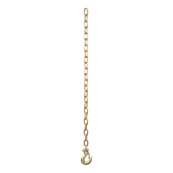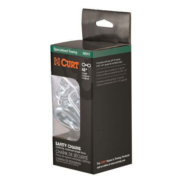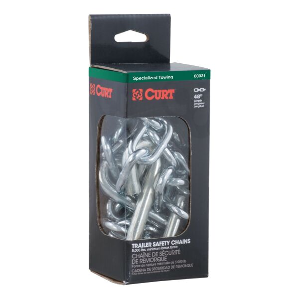 No matter how far you are planning to drive -- down the street or across the state -- using safety chains when you tow is smart, safe and required by law. Without safety chains attached, there is a serious risk of danger if your trailer becomes uncoupled from your trailer hitch. Play it safe with safety chains, and play it even safer with safety chains from CURT. CURT has a few different options when it comes to securing your trailer. This heavy-duty safety chain is made from high-quality steel and is grade-70 certified. It is equipped with a sturdy clevis hook with a safety latch for reliable coupling to your vehicle and features a minimum break force of 12,600 lbs. Remember, each safety chain assembly connecting your trailer to your vehicle must meet or exceed the gross trailer weight. This CURT safety chain measures a total length of 32" and has chain links with a 1/4" diameter. In our book, making safety a priority when you tow is a must. We offer all the safety equipment needed for successful towing, from our electrical components to our safety chains. The next time you hitch up for an adventure, always Bring It safely with CURT.