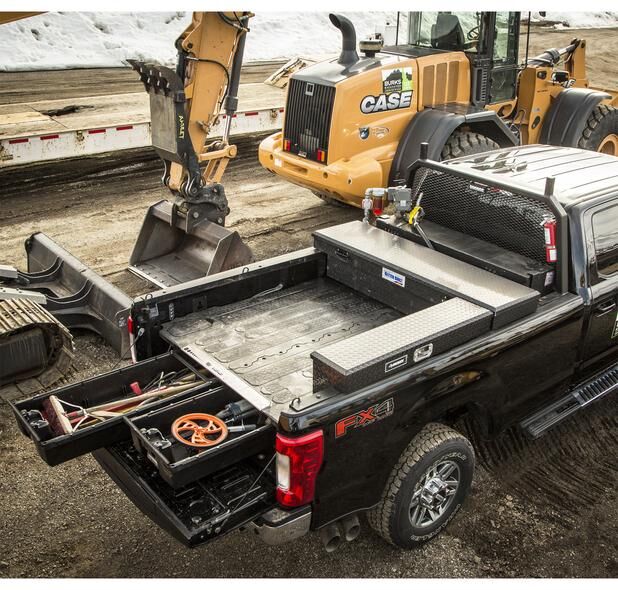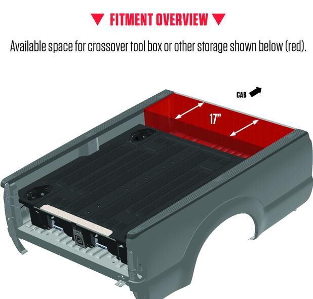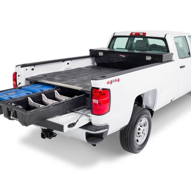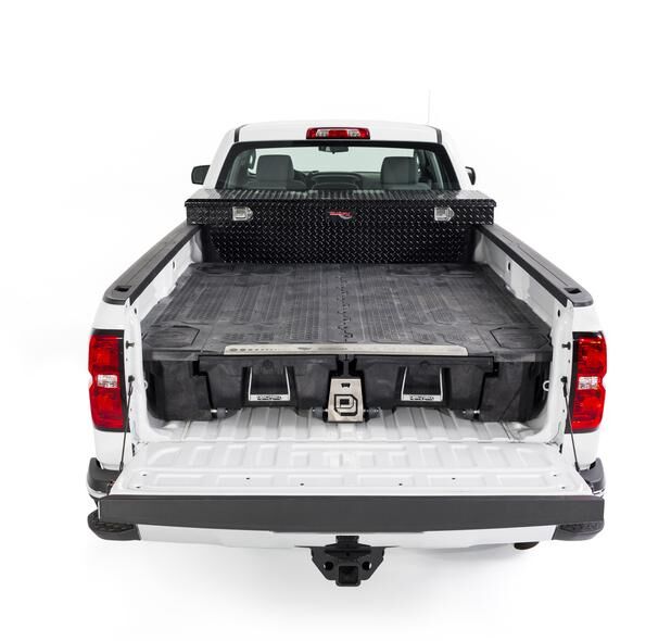 however, the system is not 8 foot long. It takes a standard bed DECKED system that is 75.25 inches long.You will have 17 inches of open space at the cabside end of your bed. A cross-over tool box or fuel transfer tank is commonly placed in this space.2019 Silverado 1500 Note: Since 2019 is a transition year for GMC, they produced a new and Old Body Style (really 2018 body style) for the 2019 Silverado 1500.Note: Because the standard DECKED system is 75.25 inches, there will be about 3.85 inches of empty space between the tailgate end of the DECKED system and the tailgate. DECKED drawers require 4 inches to be opened, but the first 5 1/2 inches of the drawer are taken up by the handle cavity and drawer taper. Thus, it is nearly impossible to remove anything from the drawers with the tailgate closed.Details:Truck Bed Organizer 19-Pres GM Sierra or Silverado 1500 8 FT DECKEDBuilt from 100 percent recycled HDPE (High Density Polyethylene) co-molded to a galvanized recycled steel subframeSystem payload rating: 2000 lbs evenly distributed on the deckDrawer payload rating: 200 lbs per drawerSystem weight: 200 lbs short bed systems, 220-230 lbs standard bed systemsTwo full bed-length drawers. Note: Drawers do not fully extend. Max drawer extension: 48 inches for reasons related to physicsDrawers are weatherproof. System itself is impervious to moisture, extreme UV light exposure and severe temperaturesOversized cast aluminum handles for ease of operation with glovesNo drilling or alteration of vehicle requiredFull line of accessories available to increase your level of awesomeWill work with a spray-in bed liner, but not a drop-in plastic bed linerWill work with a BedRug mat, but not with a Bed