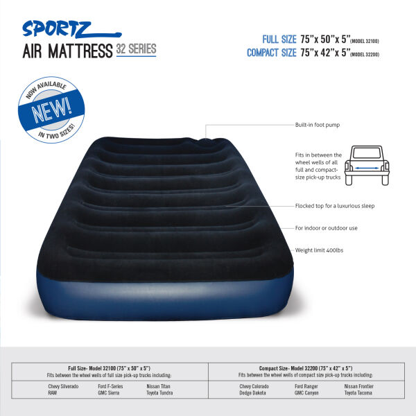 Whether you're roughing it on the living room floor or sleeping comfortably in the bed of your truck, the Sportz Air Mattress will have you supported through the night. Don't worry about packing a pump or locating a power outlet to inflate your mattress, the Sportz Air Mattress built-in hand pump allows you to inflate anywhere