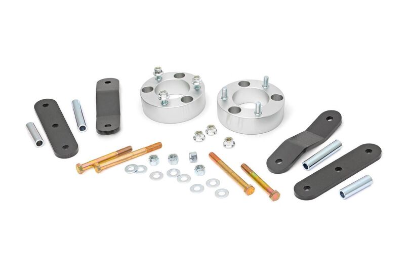 Gain greater ride height and achieve killer good looks at an incredible price with Rough Country's new 2.5in Lift Kit for '05 & up Nissan Frontier/Xterra models. This kit is ultra-easy to install! A set of strut spacers attach to the top of the strut, with no strut disassembly required, making the process considerably smoother! Also included are a set of 3/8in plate steel shackles, engineered to preserve factory ride quality and reduce driveline vibrations. These heavy duty shackles provide lift height easily and effectively, while their beefy design and powdercoat finish are durable enough to hold up to the elements. Most notably, this shackle kit includes a set of DOM tubed bolt sleeves and Grade 8 hardware, meaning unparalleled strength in an area where most competitors suffer. Now you can wheel with peace of mind knowing our strong sleeves and bolts won't break or split like cheaper alternatives.